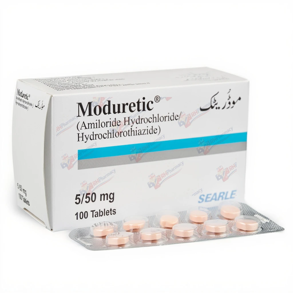 Moduretic is a combination medication containing amiloride and hydrochlorothiazide, used in the management of hypertension. It works by helping the body eliminate excess fluid and salt, which can lower blood pressure. This diuretic combination is also indicated for treating oedema associated with congestive heart failure. Moduretic helps prevent potassium loss that can occur with some diuretics, maintaining a more balanced electrolyte level. It is an effective option for patients requiring dual-action diuretic therapy.